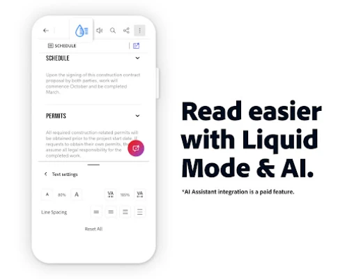 Ženkite į ateitį su "Adobe Acrobat AI Assistant". Šis dirbtinio intelekto pagalbininkas, veikiantis per "PDF Spaces", leidžia vienoje vietoje valdyti daugybę dokumentų, bendradarbiauti ir pasitelkti DI pagalbą. Galite užduoti klausimus balsu ar tekstu DI pokalbių robotui ir gauti tikslius, cituojamus atsakymus apie dokumento detales, įskaitant diagramas, grafikus ir lenteles ("Figures Q&A"). Atsakymus lengvai dalinkitės, o norėdami dar didesnio patogumo, galite klausytis jų garsu. "Generative AI Summaries" akimirksniu sugeneruos santraukas iš jūsų PDF, tinkančias el. laiškams, užrašams, tinklaraščiams ar mokymuisi. Be to, Acrobat Reader yra pilnavertis PDF redaktorius, leidžiantis mobiliuosiuose įrenginiuose redaguoti tekstą ir vaizdus, taisyti rašybos klaidas, įterpti, ištrinti ar pasukti paveikslėlius. Optinio simbolių atpažinimo (OCR) technologija pavers nuskenuotus PDF ieškoma ir redaguojama tekstine informacija.